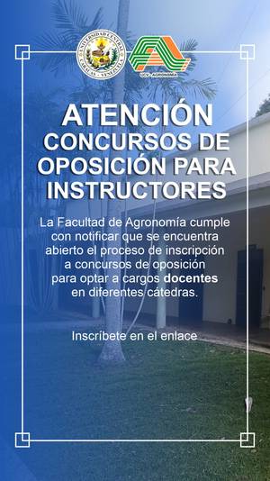 La Facultad de Agronomía de la Universidad Central de Venezuela informa que el Consejo ha abierto el proceso de inscripciones para CONCURSOS DE OPOSICIÓN, a fin de seleccionar a quienes habrán de desempeñarse como Miembros Ordinarios del Personal Docente y de Investigación de la Facultad.