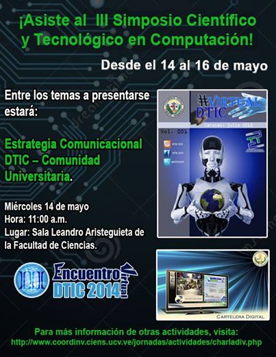 La Universidad Central de Venezuela y la Dirección de Tecnología de Información y Comunicaciones, invitan a la Charla Divulgativa “Estrategia Comunicacional DTIC - Comunidad Universitaria”, en el marco de las Jornadas de Investigación y Extensión 2014, de la Facultad Ciencias, que se realizan desde el 12 al 16 Mayo.
