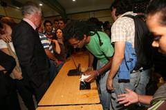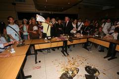 El grupo de estudiantes irrumpió a la sala cuando estaba a punto de culminar el acto de celebración del X Aniversario de COPRED, con bolsas de alimentos (chuletas) en aparente estado de descomposición.