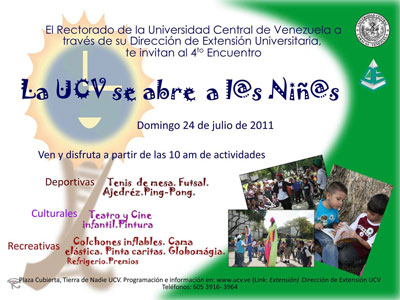 La Universidad Central de Venezuela, a través del Rectorado y la Dirección de Extensión Universitaria, se complace en invitarles al 4to Encuentro “La UCV se abre a los niñ@s”, que se realizará el próximo domingo 24 de julio, a partir de las 10 a.m., en los espacios de esta casa de estudios.