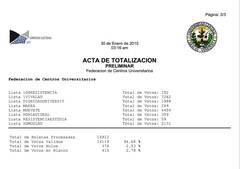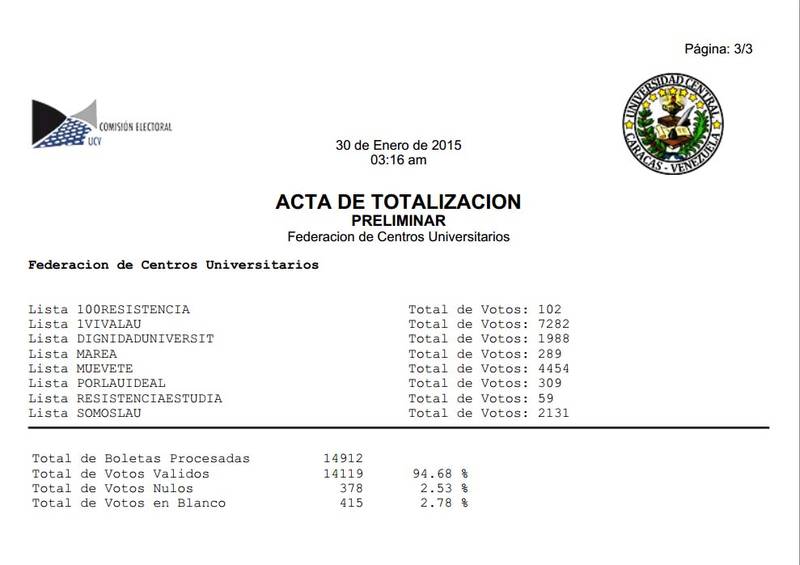 La plancha “Viva la U” gana los comicios con un total de 7.282 votos de los 14.912 registrados. La segunda fuerza política en el campus es “Muévete” con 4.454 votos, según se publica en el <media 29160 _blank>acta preliminar</media> de las elecciones, en la web de la Comisión Electoral de la UCV, donde también se están actualizando los datos de la totalización de los escrutinios .