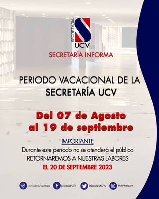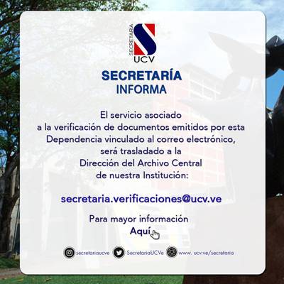 UNIVERSIDAD CENTRAL DE VENEZUELA SECRETARÍA GENERAL COMUNICADO OFICIAL Tras la información que circula en redes sociales, que afecta la imagen de nuestra institución en...[Leer más]