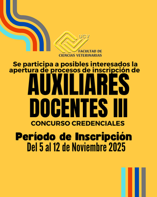 La Facultad de Ciencias Veterinarias de la Universidad Central de Venezuela participa a posibles interesados, la apertura de los procesos de inscripción de Concursos de Auxiliares Docentes III. Los requisitos exigidos se encuentran en cada post de esta publicación según área de concurso. El Proceso de inscripción se llevará a cabo del 5 al 12 de Noviembre de 2025.