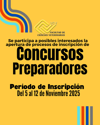 La Facultad de Ciencias Veterinarias de la Universidad Central de Venezuela participa en possibiles interesados, la apertura de los procesos de inscripción de Concursos DE PREPARADORES. Los requisitos requeridos se encuentran en cada post de esta publicación según el área del concurso. El proceso de inscripción se realizará del 29 de septiembre al 3 de octubre de 2025, ante la Oficina de Control de Estudios de la Facultad. Para conocer el detalle de las Ofertas, acceda aquí: