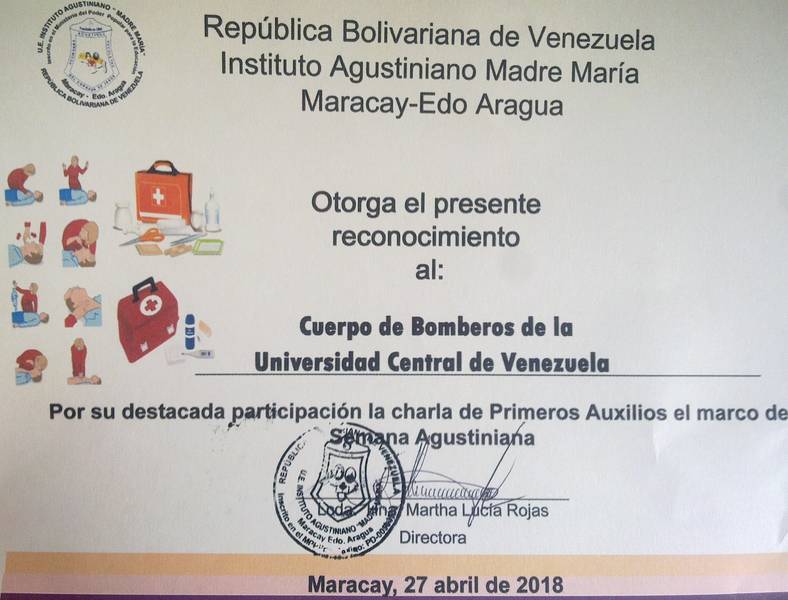 Como parte de la formación educativa que ofrece el Cuerpo de Bomberos de la Universidad Central de Venezuela (UCV) Campus Maracay, el pasado viernes 27 de abril se dictó una charla de primeros auxilios en el Instituto Agustiniano Madre María de San José de Maracay.