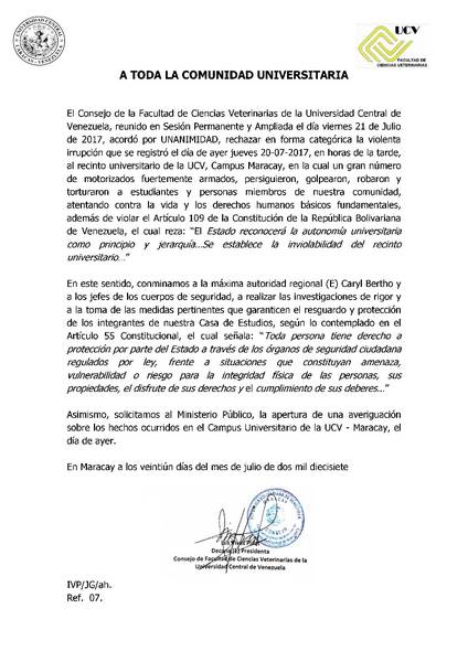 “Una vez que ingresé a la Facultad encontré a numerosos estudiantes que estaban resguardados en vista de que habían sido robados, golpeados, amenazados, amedrentados y atropellados por los policías y los motorizados armados que habían ingresado a la institución. Esta información la suministró el Presidente del Centro de Estudiantes de la Facultad de Medicina Veterinaria, Alexander García. Para ese momento ya no estaban la policía ni los motorizados y se encontraban presentes la comunidad civil y miembros de las Facultades de Veterinaria y Agronomía. Logramos ubicar a los estudiantes y gracias a Dios ninguno estaba herido, no hubo detenidos y pudimos sacarlos de la Facultad sin ningún inconveniente”, concluyó Vivas.