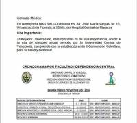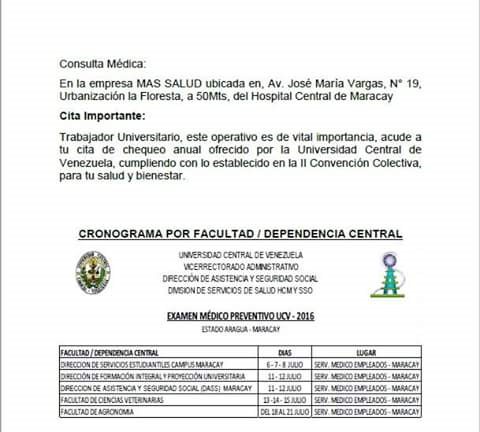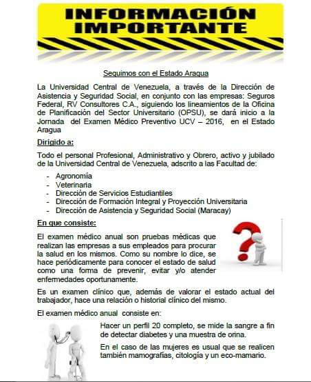 La Universidad Central de Venezuela, a través de la Dirección Asistencia y Seguridad Social (DASS), siguiendo los lineamientos de la OPSU, el próximo miércoles 6 de Julio dará inicio a la Jornada de Exámen Médico Preventivo UCV - 2016, en el Estado Aragua.