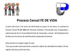 A partir del Lunes 7 de Enero 2019 y hasta el 31 de Enero de 2019, se realizará el proceso censal FE DE VIDA.