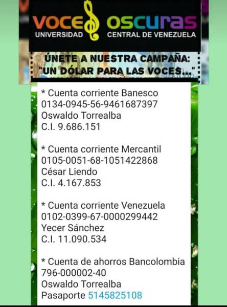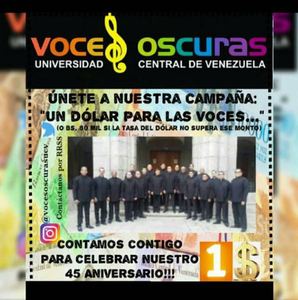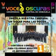 En el marco del 45° aniversario de las Voces Oscuras del Dpto. de Cultura de la UCV Campus Maracay, dirigidas por el maestro César Liendo, la agrupación efectúa una campaña de recolección de fondos para la celebración, con un monto estimado de colaboración de 1 $.