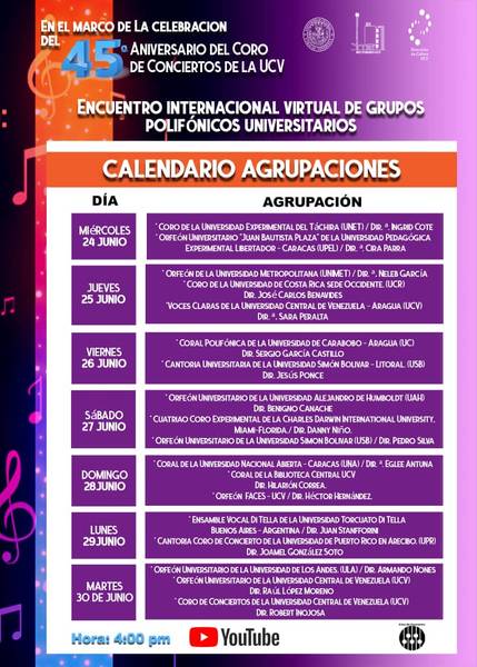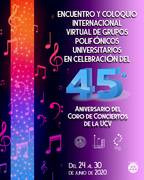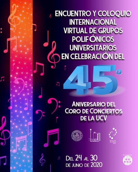 La Dirección de Cultura dependencia adscrita al Rectorado de la Universidad Central de Venezuela celebró el 45° aniversario del “Coro de Conciertos UCV”, con un Encuentro y Coloquio Virtual Internacional de Agrupaciones Polifónicas Universitarias desde el 24 hasta el 30 de junio.