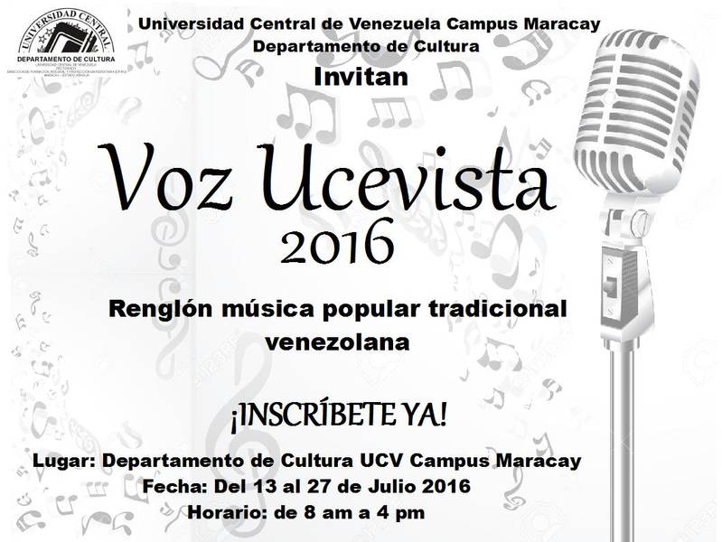 Nuevamente la Universidad Central de Venezuela (UCV) Campus Maracay, se prepara para celebrar la Voz Ucevista 2016 de las facultades de Agronomía y Ciencias Veterinarias en un evento que contribuye al desarrollo, estímulo y divulgación de la actividad musical en el Campus Maracay.