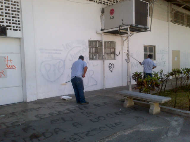 Directora de Mantenimiento UCV, Carmen Yegresr informó que desde el pasado 5 de abril, el equipo de la dirección, junto a los jefes de mantenimiento de FaCes, Ciencias Jurídicas y Políticas, y Humanidades, iniciaron una jornada para quitar los grafftis pintados la noche del pasado 1 de abril en el campus ucevista por grupos de motorizados, al parecer oficialistas.