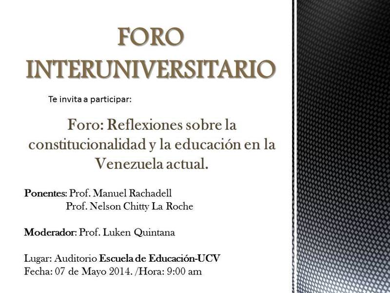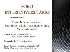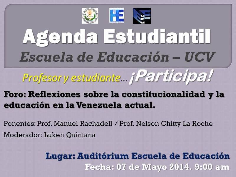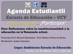 Agenda Estudiantil de la Escuela de Educación de la UCV y el Foro Interuniversitario invitan al Foro ”Reflexiones sobre la constitucionalidad y la educación en la Venezuela actual”. El encuentro se realizará este miércoles 7 de mayo, a las 9:00 a.m., en el Auditórium Escuela de Educación UCV.