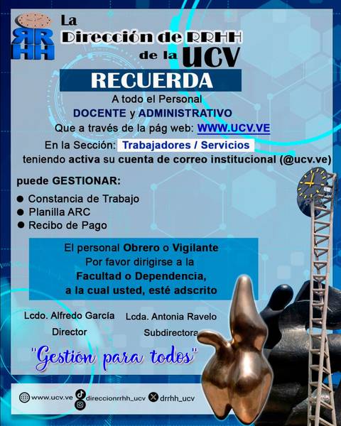 A todo el personal Docente y Administrativo que a través de la página Web: www.ucv.ve en la sección: Trabajadores y Servicios y teniendo activa su cuenta de correo institucional (@ucv.ve) puede gestionar