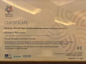 Este premio reconoce el valor del proyecto "Fortalecimiento de competencias tecnopedagógicas en tecnologías emergentes en docentes de la Universidad Central de Venezuela: Microcertificaciones en Inteligencia Artificial" el cual se generó desde el Sistema de Educación a Distancia (SED-UCV), con apoyo de otras dependencias, como el CENAMB-UCV, para el desarrollo de habilidades y competencias en IA aplicadas a la Educación Superior.